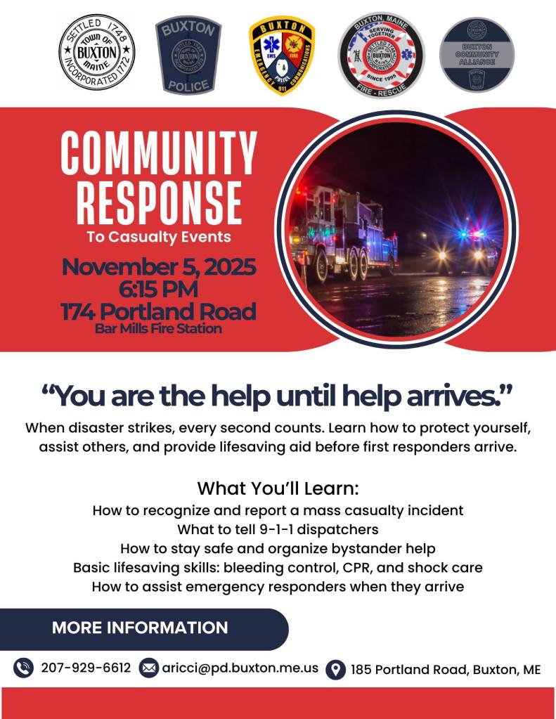 Join us at the November Buxton Community Alliance event for “Community Response to Casualty Events.”
